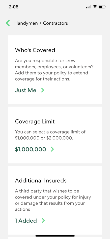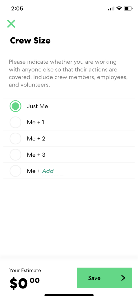 If this feature is supported in your state, you will be prompted to add your crew when you purchase your policy (see screenshots below). If your business is not located in one of these states, coverage is priced and offered for one person. However, we encourage you to check back often — we are continually expanding this capability to new states and developing tools for larger businesses and categories of sub-contractors.